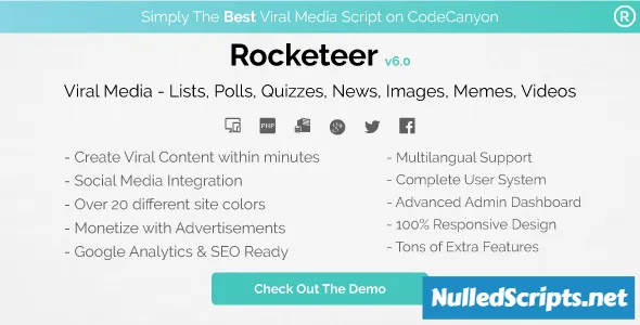 Rocketeer is an all-in-one premium Viral Media script. You can create polls, quizzes, reports, upload images, create memes and send videos. Viral media sites have gained popularity recently and are still growing today! Rocketeer lets you launch your own viral site in minutes. Build a website like BuzzFeed!
