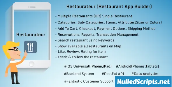 Native cross-platform solution for iOS and Android iOS Universal (iPhone and iPad), Android (phones, tablets) Not only one restaurant, but also support multiple restaurants List of restaurants List of restaurants on the map Search for restaurants using keywords Browse categories, subcategories and detailed information about items from each restaurant Item attributes such as sizes or colors with different price Add to cart, Cart management, Payment option at checkout (Paypal, Cash on delivery, Bank transfer)